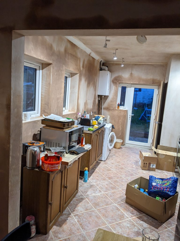 - We no longer have any builders or plasterers in the house, which means not moving the contents of the kitchen upstairs every night. We have about 30% of our old kitchen left, the new one arrives 12th December.