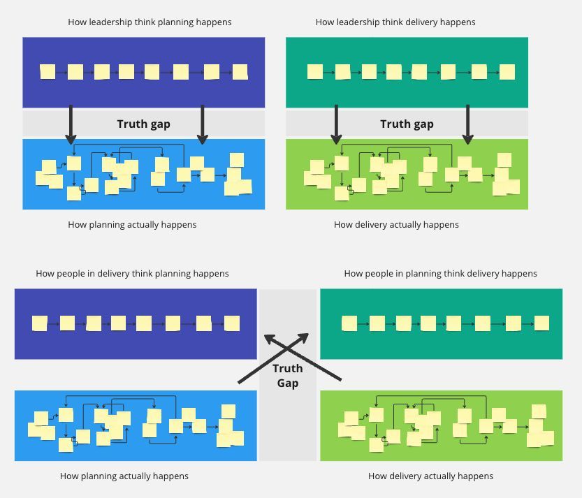 - I was also reflecting that the truth gaps doesn’t just exist between levels of leadership and employees. It also exists between people involved in different parts of the process (especially if the process specifically keeps them apart). This means that even for people ‘on the ground’ they have very different expectations about what happens before or after they do their work. I drew a picture of it as well…