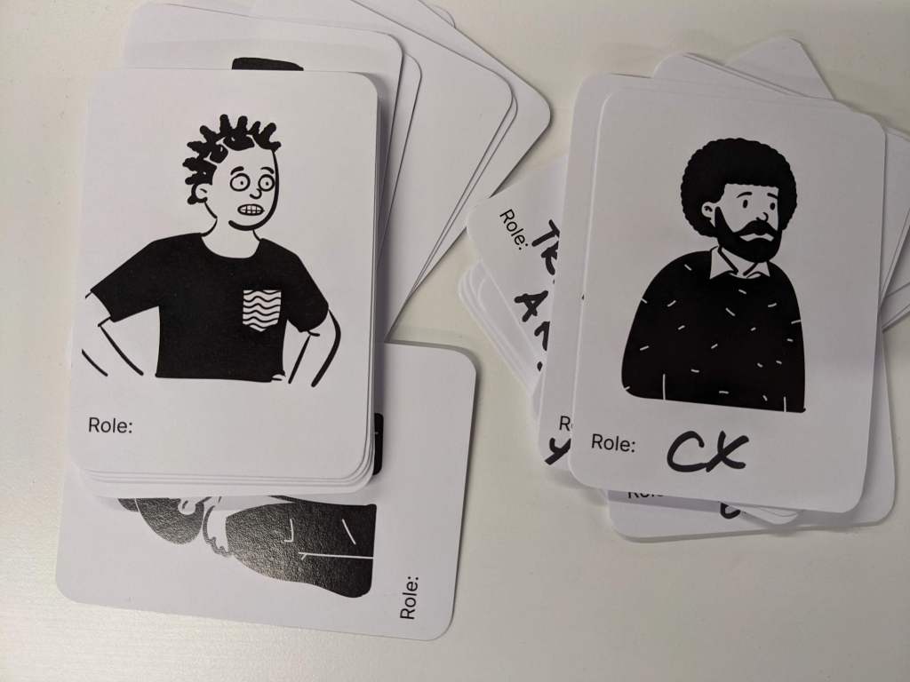 - Print stuff. The preparation it takes to print something immediately sets this conversation aside from 90% of the ones people are in day in day out. For this session I printed some big A0 map templates (pretty standard stuff) but added some of the client/project branding. The thing I was more proud of was printing some ‘people cards’ using Open Peeps illustrations. This was to help groups add people into the processes they were mapping out, and because I felt it would break the ice a bit too. They’re fun illustrations. You can download a PDF to set to a printer if you want.